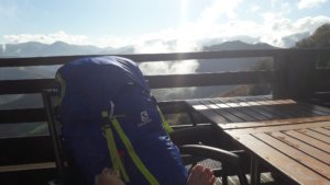 Hiába a kialvatlanság, győzött az izgalom, úgyhogy elég nehezen ment az elalvás a nyikorgó kanapénkon előző este, pláne, hogy roppant népszerű spanyol hálótársunk telefonja 5 percenként rezgett fél éjszaka. Ezt még tetézte azzal, hogy fél 6-kor kipattant az ágyból, és vad pakolásba kezdett. Kb. 10 percig bírtuk még Zsomborral, aztán mi is keltünk. Sejtettük, hogy a következő jó néhány naphoz képest ez egy minőségi szállás lehetett, nehéz is volt búcsút venni tőle 7:35-kor (az előírt 7:30 helyett). Én még bepróbálkoztam egy reggelivel 7-kor, de a szállásadónk épp akkor zárta a konyhát, csak egy nagyon drága és elég vacak kávéhoz jutottam hozzá. Zsombor 8 – időközben meglehetősen szottyossá vált – kiflivel érkezett otthonról, gondoltam, amíg nem jutok más táplálékhoz, megkönnyítem a mai napját és megeszek egyet. Próbáltam összerakni a túrabotokat, de valahogy az egyik csak nem akart egyben maradni… de egy kreatív reggeli férfiagynak köszönhetően az út első sebtapasz-darabja a renitens boton landolt. Az ötletért cserébe át is engedtem Zsombornak.