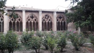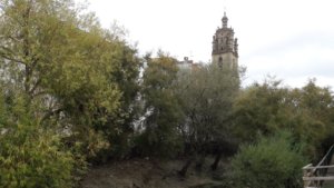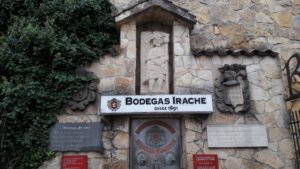A tervezett első megállót hamar elértük: boldogan olvastam a könyvemben, hogy van Estella közelében, nem sokkal Ayegui után az Út mentén egy ingyenes borforrás (Fuente del Vino), ami a Bodegas Irache nevű borászat ajándéka a zarándokoknak. Ott találtuk Susanne-t, az erre elkülönített palackját töltögette, mi is megszabadultunk a vizünk egy részétől, és felszerelkeztünk fél-fél liter vörösborral. Susanne csinált rólam borcsapolós képet kifejezetten a blogba, de vállalhatatlannak találtam, meg különben se szerepeljek már alkohollal közös képen nyilvánosan 🙂 A reggeli áhítat-program sajnos elmaradt, a Monasterio de Irache bencés kolostort csak kívülről tudtuk megnézni mert zárva volt.