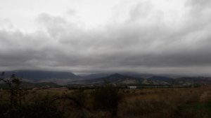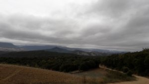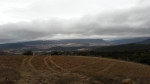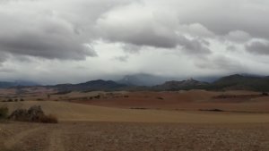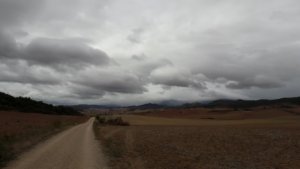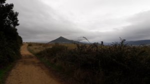 A borforrástól egy kisebb csapatban (többek között Susanne-nel és pár svéd lánnyal) haladva nemsokára elértünk egy elágazáshoz, ahol mindkét út mai végcélunk, Los Arcos felé vezetett, de a valamivel rövidebb egy kisebb hegyen, a hosszabb Azquetán és Villamayor de Monjardinon keresztül. Nem volt kérdés, hogy Zsombor a hegyit választja, majdnem mindenki a kényelmesebb felé indult, szóval én is inkább a hegyre szavaztam. Zsombor hamar lehagyott, meg nemsokára a zacskós leveses japán fiú is, úgyhogy egy jó ideig egyedül mentem. Komoly fejtörést okozott, hogy felmásszak-e a kilátás kedvéért egy bunkerszerű magaslesre, de végül kihagytam (ezt azóta is sajnálom kicsit). Az idő kellemes volt, bár egész nap borús, a hegymenet szerencsére nem fárasztó, a végén pedig még Zsombor is előkerült, valami kis dombon várt be, aztán szaladt utánam.