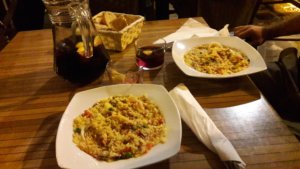 A két étterem közül az egy kiesett az eső miatt, a másik fedett terasza és a menü viszont abszolút meggyőző volt. Az egyik asztalnál csupa ismerős: Susanne, a “Spanyol lány” (azaz a libanoni Nour) és a mindig vele lógó “Angol fiú” (azaz a holland Thom), a vidám dán (akitől a hátizsák-pakoló leckéket kaptam), az előző esti ausztrál pasi, Chris, meg még jó néhányan. Egy pillanatig megfordult a fejemben, hogy csatlakozni kellene, de ha már egyszer tényleg ez az utolsó közös esténk Zsomborral, inkább csak vele töltöm. Rábeszéltem a paellára (seafood, ugyanis már ilyeneket is eszem!) meg egy nagy kancsó Sangriára, egyik sem okozott csalódást. Sokat beszélgettünk, kellemes este volt, de ez az albergue is 10-kor zárt…