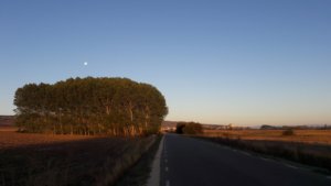 A reggelizést ma is későbbre terveztem, volt még egy kis tegnapi maradékom (baguette, chorizo) meg a folyamatosan cipelt müzli-szeletek, inkább haladni akartam, hogy mielőbb Burgos-ba érjek. Így aztán sikerült megtekintenem a hátam mögött a napfelkeltét, előttem pedig még ott ragyogott a telihold, miközben egyetlen felhő sem volt az égen, ellenben dermesztően hideg. Szeretem ezeket a Camino-reggeleket, annyira friss és nyugodt minden, a gyaloglás is ilyenkor megy a legjobban, nem a forró délutánokon.