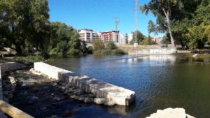 Jeleket nem nagyon láttunk, így mentünk a megérzésünk után, de mivel a katedrális a folyó partján, a municipal albergue meg a közelében volt, a folyót követve annyira nem lőhettünk mellé. Egy idő után aztán nyilakat is találtunk, ezek átvezettek a boltokkal, kávézókkal, éttermekkel teli sétálóutcákra, de sziesztaidőben érkeztünk, úgyhogy szinte minden kihalt volt. Nem úgy a municipal albergue melletti kis tér, ahol alig tudtuk átverekedni magunkat a tömegen, miközben egy apró bárból hangosan szólt a zene.