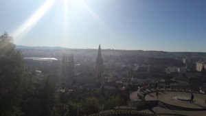 A Castillo csak 11-kor nyitott, olvastam róla ezt-azt a könyvemben, és úgy tűnt, nem éri meg még 3/4 órát várni, hogy bemehessek. Belestem (és befényképeztem) a kapun, körbejártam egy kis ösvényen a falak mellett, és inkább a várfal tövében kialakított kilátóteraszon nézelődtem hosszabban. Innen szinte az egész várost be lehetett látni, természetesen központban a katedrálissal, ami mindenhonnét lenyűgöző látványt nyújt, a futóverseny hangosbemondójának hangjai pedig még ide is felszűrődtek.