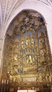 A Szent Mária-kapun keresztül vissza is sétáltam a katedrálishoz, ahol már szépen gyülekeztek az emberek a misére, helyiek és zarándokok vegyesen. A miséket természetesen nem a főhajóban, hanem az oldalkápolnákban tartják, már délelőtt utánanéztem, hogy az esti melyikben lesz, így sikerült még időben beesnem, és helyet is találnom, de még utánam is jöttek, valakinek már csak állóhely jutott. Nem volt annyira bensőséges, mint a múlt vasárnapi los arcos-i, de legalább itt nem is bőgtem annyit, pedig most legalább annyira fenyegetett az egyedüllét veszélye, mint akkor, sőt…