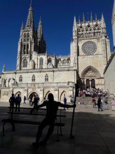 Egy másik kis utcán visszakeveregtem a katedrális felé, jópofa volt ez városrész is és alig találkoztam emberekkel, csak néhány kóbor zarándok jött itt-ott szembe. Például Susanne, úgy látszik, bejött a ‘See you later’ . Ő már túlesett a katedrális-látogatáson, és épp az utolsó pillantásokat vetette rá messziről, hogy aztán elinduljon a következő faluba, ahol a délutánt tervezte eltölteni és később dolgozni kicsit (valami szöveget kellett még összerakni a rövidfilmjéhez, kellett a nyugodt környezet). Most már kicsit komolyabban vettünk búcsút egymástól, nem beszéltünk meg semmit, de persze egyértelmű volt, hogy kapcsolatban maradunk. Kicsit szomorú voltam, hiszen az elmúlt 6 napban nagyon sokat voltunk együtt, hiányozni fog…