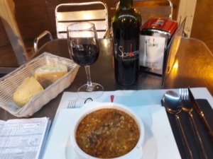 A városban még mindig nagy volt a nyüzsgés (nem sokban különbözött a szombat estitől), főként a parti sétányon, ahol ugyan az árusok lassan már kezdtek összepakolni, de az összes kávézó és cukrászda tele volt emberekkel. A 9-ig nyitva tartó apró könyvesboltba muszáj volt bemennem, magamba szívni egy kis új könyv illatot, meg válogatni a zenék és filmek között, persze nem vettem semmit, viszont jó volt látni, hogy a spanyolok még ilyenkor is lelkesen vásárolnak. Éttermet viszont nem sikerült találnom a sok kávézó között, így jobb ötletem nem lévén, megkerestem a tegnap esti helyet, ott legalább ismertem a kínálatot, de közben spanyol vacsoraidő lett, így szabad asztal már nem akadt. A szomszédos étteremben viszont igen, és ígéretesnek tűnt a 12€-s zarándokmenü, úgyhogy oda telepedtem le. Végre kicsit változatosabb volt a kínálat, mint az eddigi “pilgrim’s menu”-ben, nem csak saláta vagy tészta előételként, hanem leves is, főételként pedig lazac krumplival, desszertnek almatorta és – hogy legyen valami jó is abban, ha az ember egyedül eszik – egy egész üveg vörösbor! Szerencsére nem szorított a 10 órás takarodó, úgyhogy ráértem szép nyugodtan vacsorázgatni, közben blogot írni, és így a teljes üveg bor is lecsúszott…