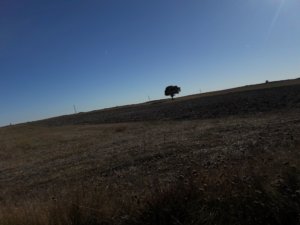 Innentől pedig következett az igazi Meseta-élmény: szikrázó napsütés, kánikula, por, szárazság, és semmi árnyék. Na jó, egyszer csak akadt egy leágazásnál valami kis piknikező hely egy forrással meg kis fákkal (Fuente de Praotorre, ami sokszor elapad), de messziről kiszúrtam, hogy egy pár(?), a korábban már látott gitáros pasi és a vele gyalogló nő üldögél ott, és inkább visszafordultam és folytattam tovább az utat a Meseta legmagasabb pontja felé.