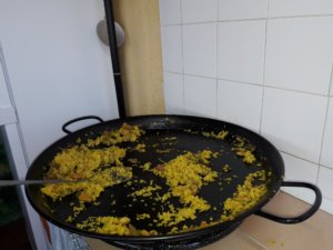 Mire beértem a kertből nyíló étkező helyiségbe, már minden tányérban kiszedve a paella, több tál saláta, kenyér és jó néhány kancsó vörösbor várt az asztalon (sajnos a paellának már csak a maradékát sikerült megörökítenem).