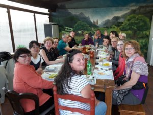 A hangulatról egy amerikai és egy szlovén úriember gondoskodott, ők kitalálták, hogy mondjunk tósztot, de aztán csak a szlovén, Igor nyomott le egy hosszú beszédet, majd mindenki elmondta a saját nyelvén, hogy “Egészségedre” (boldog volt, hogy magyarul ő is tudta), miközben az utolsó cseppig elfogyott a jó kis vörösbor. Desszertnek még valami citromos krémet is kaptunk, nem lehetett panaszunk a házigazdákra, mindenre nagyon odafigyeltek, megérte az árát a 10€-s vacsora. Sajnos nem mindenkivel tudtam beszélgetni, inkább csak a körülöttem ülőkkel, de a japán Erikával és a kanadai Elizabeth-tel, na meg persze az alaszkaiakkal elég sokat. Az idős portugál házaspár (velük is már többször találkoztam, ők voltak pl. az agés-i későn kelők a szobámban) férfi tagja egyáltalán nem tudott angolul, a felesége fordított neki, de a szemén látszott, hogy fiatalabb korában nem kellett félteni, nagy nőcsábász lehetett. A szlovén Igor is próbált annak tűnni, odáig volt, hogy biztosan ő gyalogol együtt a legszebb lánnyal a Caminon, ezért elég furcsa is volt, hogy mit keres ez a szép és fiatal olasz lány egy ilyen pasi mellett…