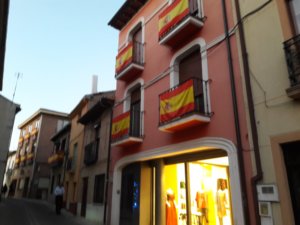 A Santa María templomban épp elkezdődött a mise, így oda inkább nem mentem be, viszont a szemben lévő “zarándok bolt” még nyitva volt, tele mindenféle hasznos holmival. Egy kisebb vagyonért beszereztem egy újabb adag kis tisztálkodószert, az elhagyott zoknim pótlására egy kagylóval díszített Camino-modellt, és a mai hosszú szakasz teljesítését megjutalmazva, egy pár kagyló formájú fülbevalót. Elisabeth korábban említette, hogy holnap Spanyolország nemzeti ünnepe miatt valószínűleg zárva lesznek a boltok, így próbáltam valami élelmiszerhez is jutni, de az egyetlen még nyitva tartó helyet ennek megfelelően már eléggé lefosztották, szóval sok mindent már nem kaptam. A város erkélyein azonban szép számban jelentek meg a spanyol zászlók október 12-e, azaz a Spanyolság ünnepe (Día de la Hispanidad) tiszteletére, ami jelen esetben Amerika felfedezésének 525. évfordulóját is jelentette.